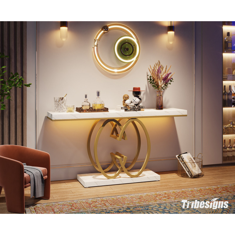 Adauga un strop de lux in locuinta ta cu aceasta consola moderna cu blat alb marmorat si structura metalica aurie. Ideala pentru holuri, livinguri sau spatii de receptie, aceasta piesa de mobilier este conceputa pentru a imbina estetica sofisticata cu functionalitatea practica.